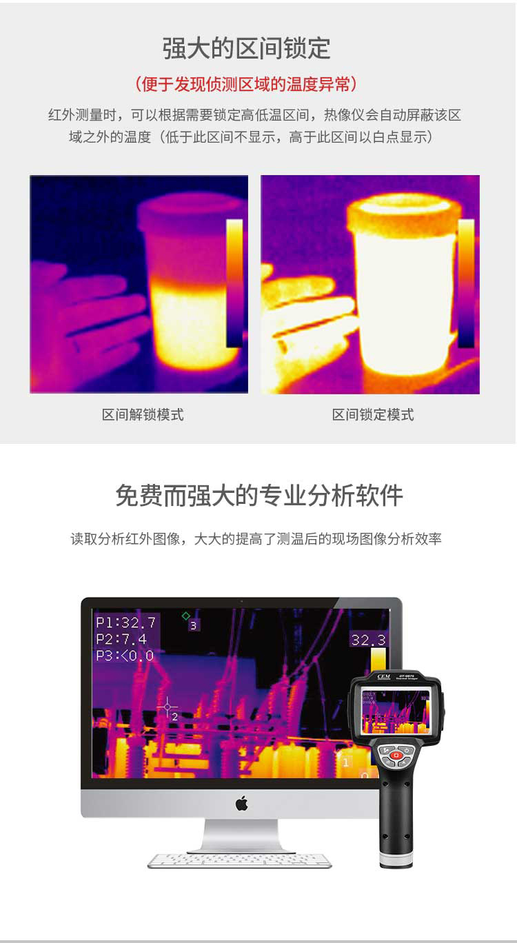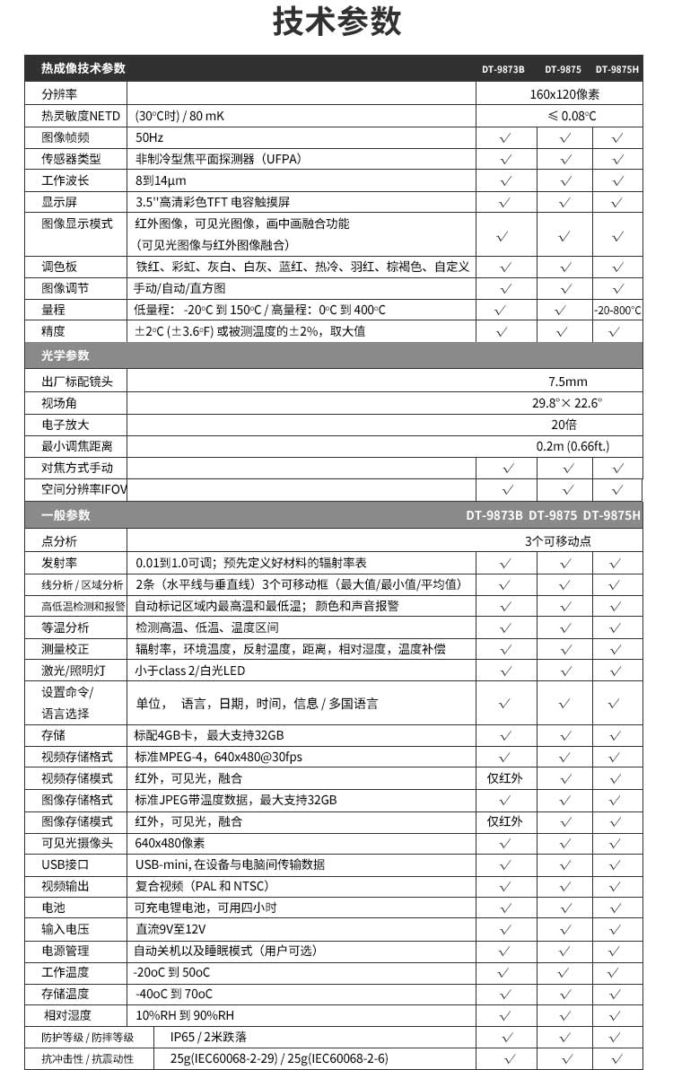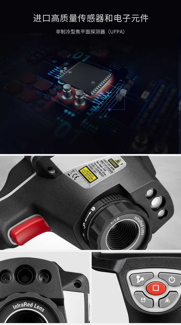 標(biāo)配鏡頭7.5mm,分辨率160×120,IFOV:3.33mard,視場(chǎng)角29.8×22.6°,熱靈敏度NETD<0.08℃,圖像幀頻50Hz,溫度范圍(-20-150、0-400),可見光分辨率640×480像素