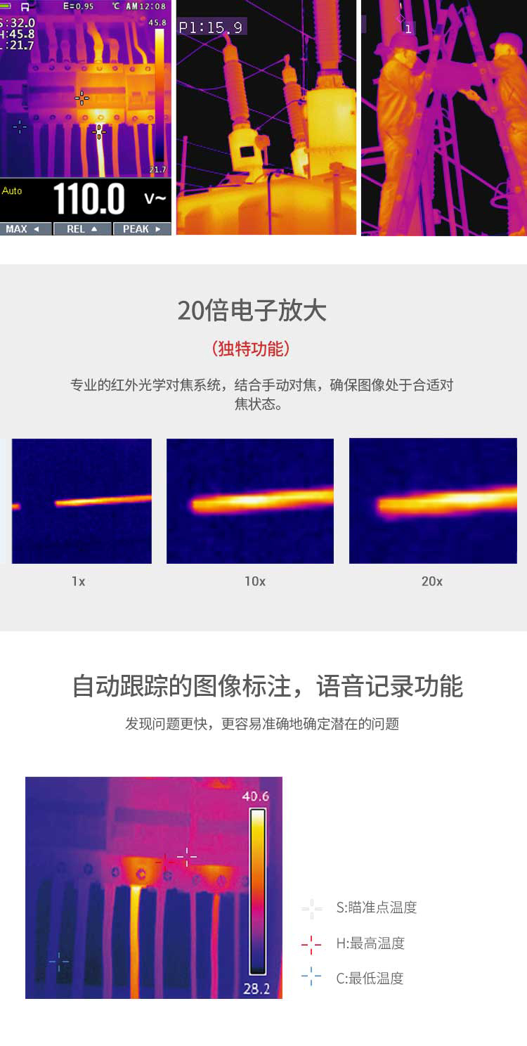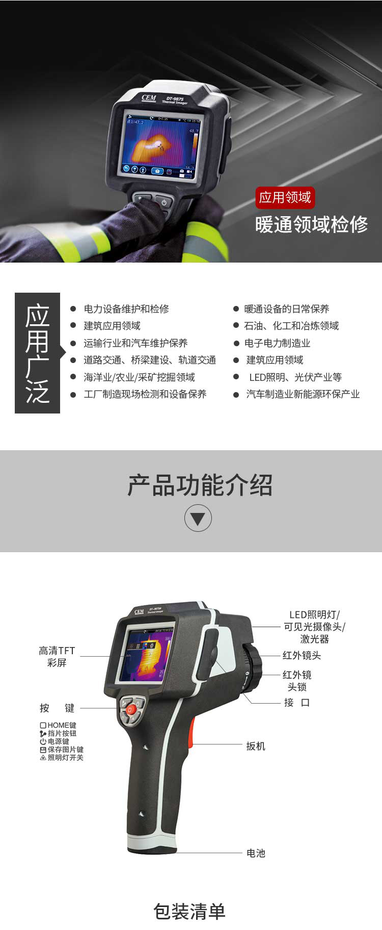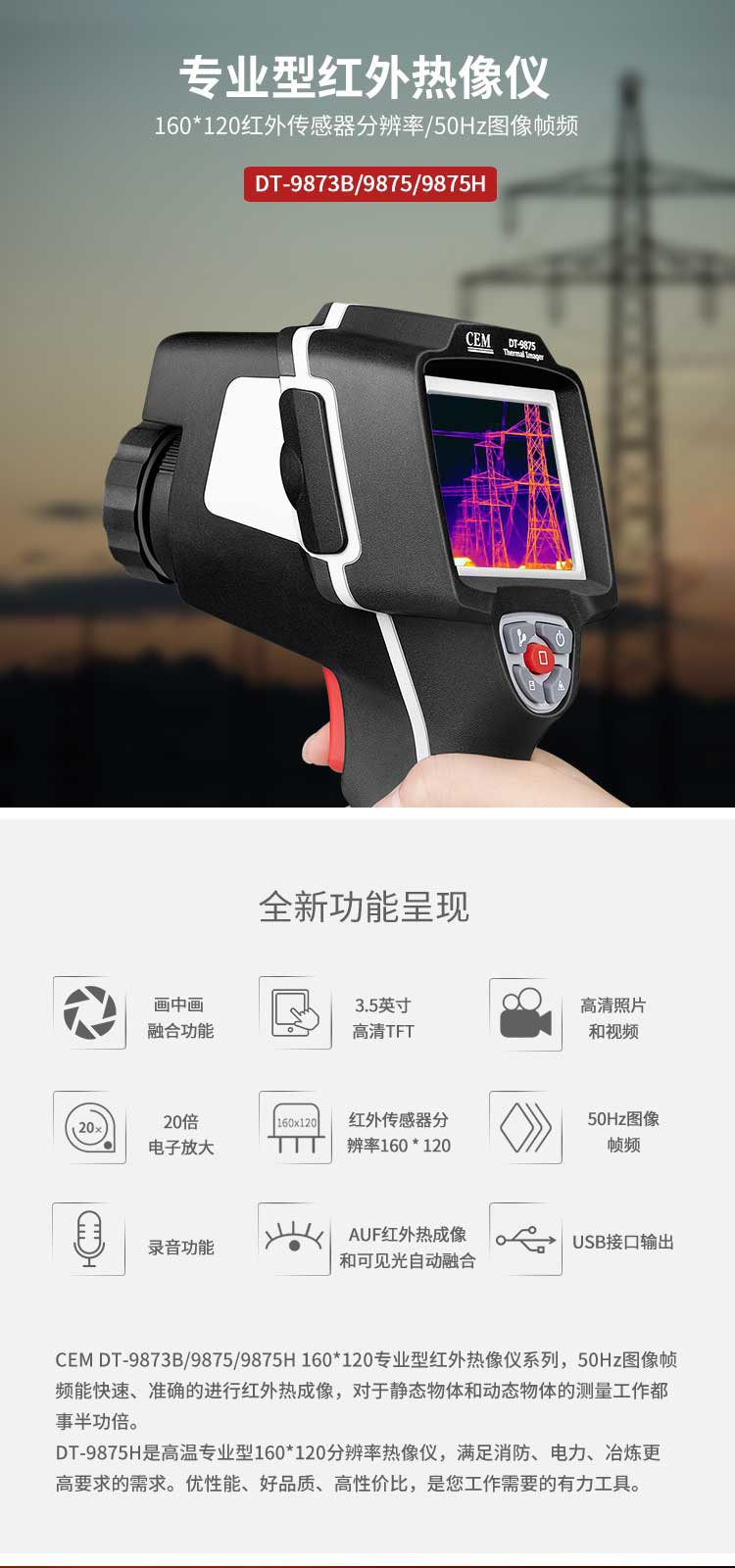 標(biāo)配鏡頭7.5mm,分辨率160×120,IFOV:3.33mard,視場(chǎng)角29.8×22.6°,熱靈敏度NETD<0.08℃,圖像幀頻50Hz,溫度范圍(-20-150、0-400),可見光分辨率640×480像素