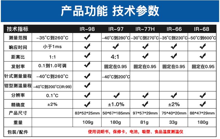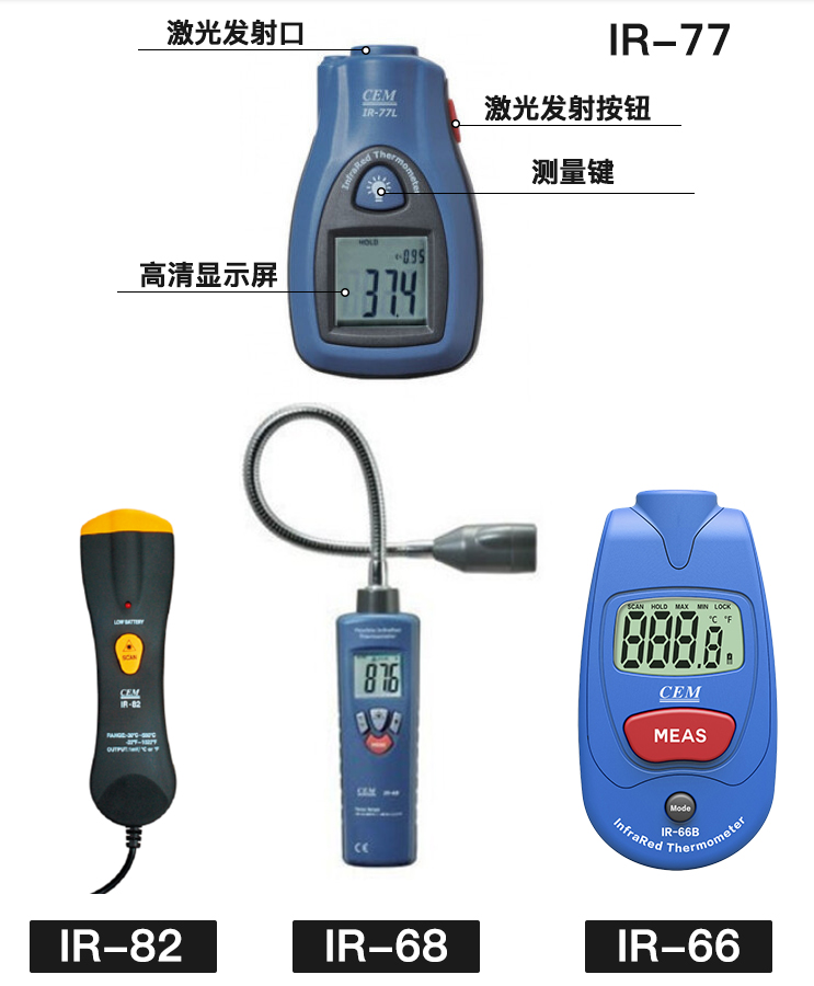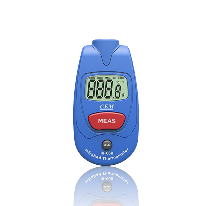 IR-66掌上式紅外測溫儀包括IR-66、IR-66B兩個型號。 CEM出品的IR-66系列掌上式紅外線測溫儀,符合人體工程學設計,其體積比手掌還小,方便攜帶,是您工作上各種設備檢修、溫度情況了解,以及您日常生活起居的多功能測溫儀佳選擇。 IR-66掌上式紅外線測溫儀特性: 1.*的非接觸式測量 2.獨特新穎的外觀設計 3.自動關機及自動記錄數(shù)據(jù) 4.℃/℉ 轉換裝置 5.自動量程選擇及大小值記錄 6.小巧的尺寸設計使測量方便又便于攜帶 7.大的液晶顯示屏 8.上鎖功能及低電量提示