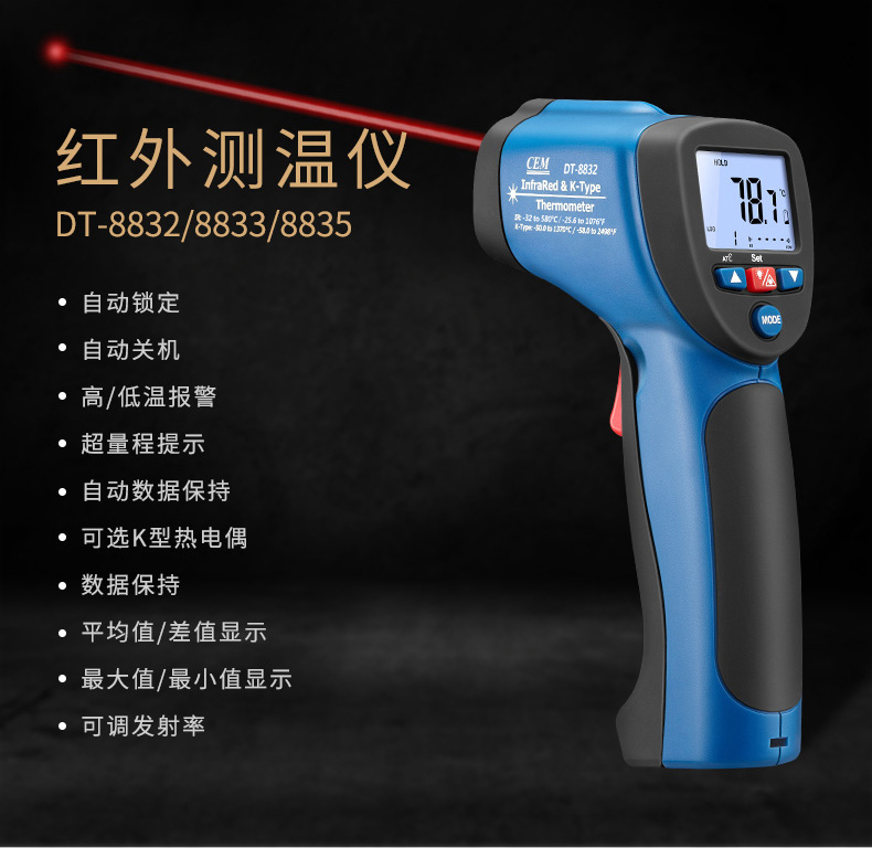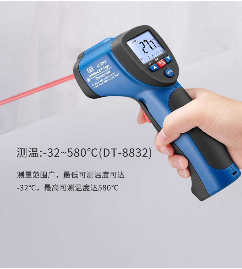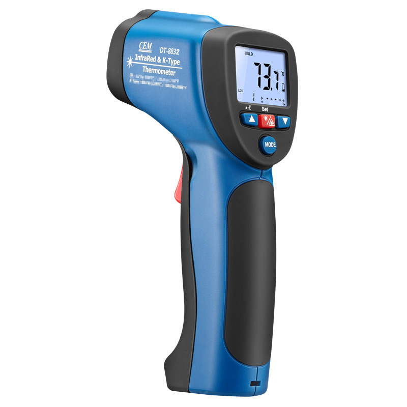 華盛昌DT-8832二合一紅外線測(cè)溫儀屬于紅外測(cè)溫儀,鋌和華盛昌CEM品牌專區(qū)提供詳細(xì)的華盛昌DT-8832二合一紅外線測(cè)溫儀介紹,包括華盛昌DT-8832二合一紅外線測(cè)溫儀價(jià)格、基本參數(shù)、產(chǎn)品特點(diǎn)、華盛昌DT-8832二合一紅外線測(cè)溫儀圖片、功能及適用范圍等信息,還有華盛昌DT-8832二合一紅外線測(cè)溫儀問答及用戶評(píng)價(jià)為您選購提供全方位的參考。想了解更多更全的華盛昌CEM紅外測(cè)溫儀報(bào)價(jià)、型號(hào)、種類以及使用方法相關(guān)內(nèi)容,可以到華盛昌CEM品牌專區(qū)。 華盛昌DT-8832二合一紅外線測(cè)溫儀是紅外測(cè)溫和K型溫度測(cè)溫結(jié)合的二合一紅外線測(cè)溫儀 雙注塑機(jī)殼、1米防摔,高達(dá)30:1的距離比 帶K型熱點(diǎn)偶測(cè)溫,可以根據(jù)您的需要適應(yīng)不同場(chǎng)合的測(cè)溫要求。 溫度段從380℃至1050℃滿足測(cè)溫場(chǎng)景 ℃/℉溫度單位轉(zhuǎn)換 可達(dá)±1.5%測(cè)量精度 自動(dòng)數(shù)據(jù)保持 20個(gè)數(shù)據(jù)儲(chǔ)存 最大值/最小值顯示 K型熱電偶測(cè)溫(量程設(shè)計(jì)-50℃至1370℃) 超亮背光LCD顯示,在暗處也可以輕易測(cè)量和讀數(shù) 自動(dòng)獲取目標(biāo)的可調(diào)發(fā)射率,可測(cè)量不同材質(zhì)的物體表面溫度 距離比D:S=16:1,30:1供選擇,高距離比可遠(yuǎn)距離測(cè)量更小尺寸目標(biāo)