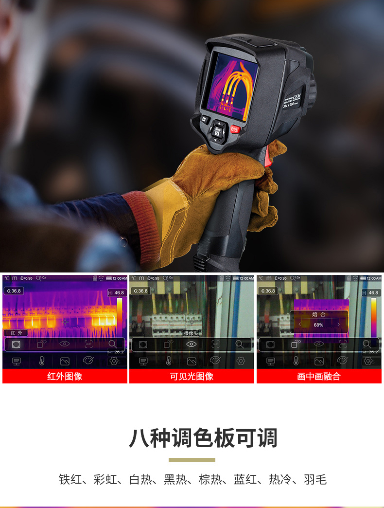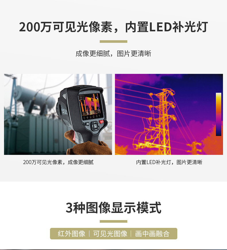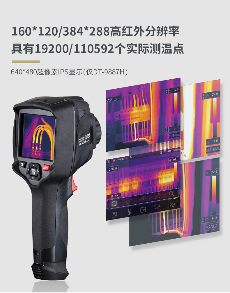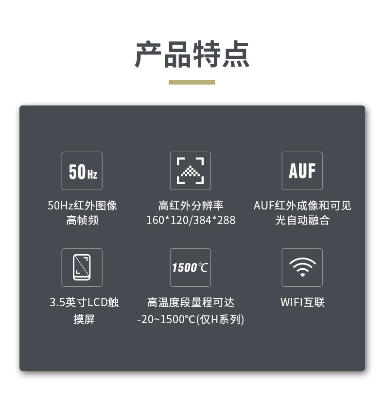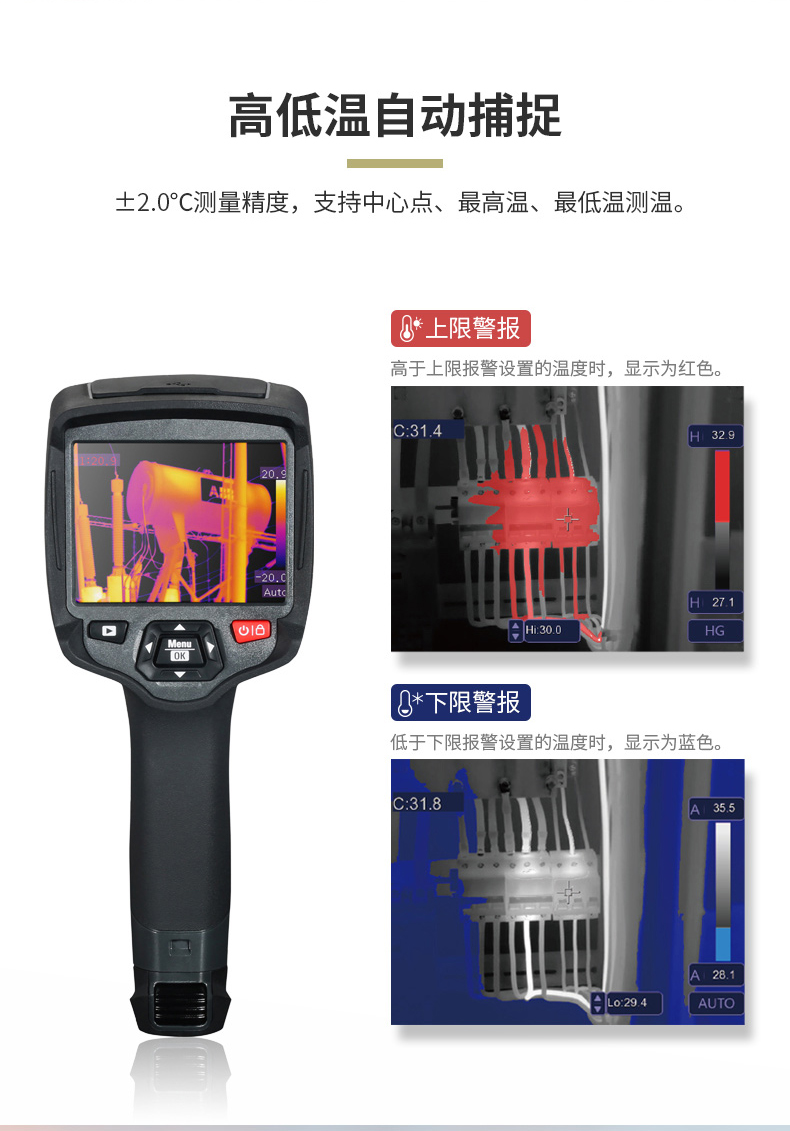 標(biāo)配鏡頭22mm,分辨率324×288,IFOV:1.14mard,視場(chǎng)角24.5×18.6°,熱靈敏度NETD<0.06℃,圖像幀頻50Hz,溫度范圍(-20-150、0-400),可見(jiàn)光分辨率640×480像素