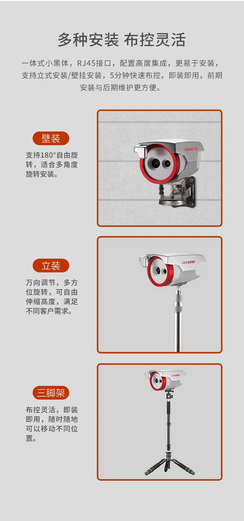 注意事項(xiàng) 紅外熱像告警系統(tǒng)應(yīng)正確安裝,可自動跟蹤人體額頭區(qū)域并顯示體溫,操作人員應(yīng)經(jīng)生產(chǎn)廠家專業(yè)培訓(xùn),并嚴(yán)格按說明書使用。 ·應(yīng)嚴(yán)格按照中國國標(biāo)(GB_T19146-2010)和各地市場監(jiān)管局的要求創(chuàng)造使用條件;﹒嚴(yán)格按照規(guī)范要求,安裝在室內(nèi)無風(fēng)或者微風(fēng)的固定位置使用,室溫環(huán)境在16°℃~32℃,避免陽光、風(fēng)和其他熱源干擾(環(huán)境溫度超出16°℃~32°℃,需要安裝空調(diào),并在產(chǎn)品3m內(nèi)無風(fēng)或者微風(fēng)); ·若安裝在室外,必須搭建棚子或者板房來保證環(huán)境穩(wěn)定; ·戶外陽光照射后、劇烈運(yùn)動后或從溫差較大的戶外場景進(jìn)入室內(nèi),需在室內(nèi)環(huán)境平靜靜置5分鐘后進(jìn)行測試。