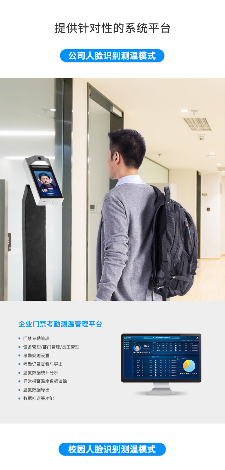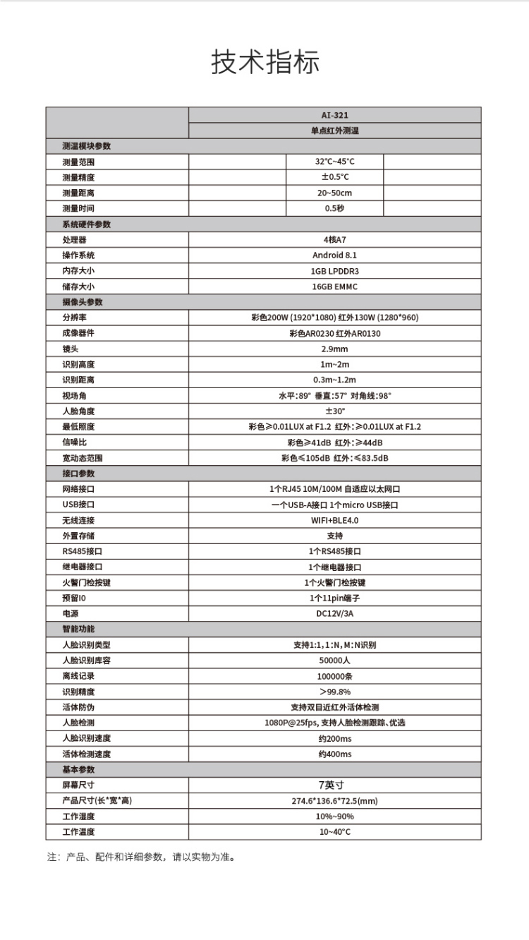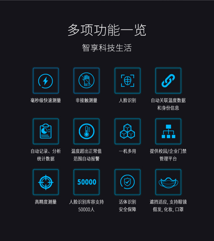 單點(diǎn)紅外測(cè)溫、測(cè)溫范圍:16-45℃、50000大容量存儲(chǔ)、只能AI人臉識(shí)別、一機(jī)多用