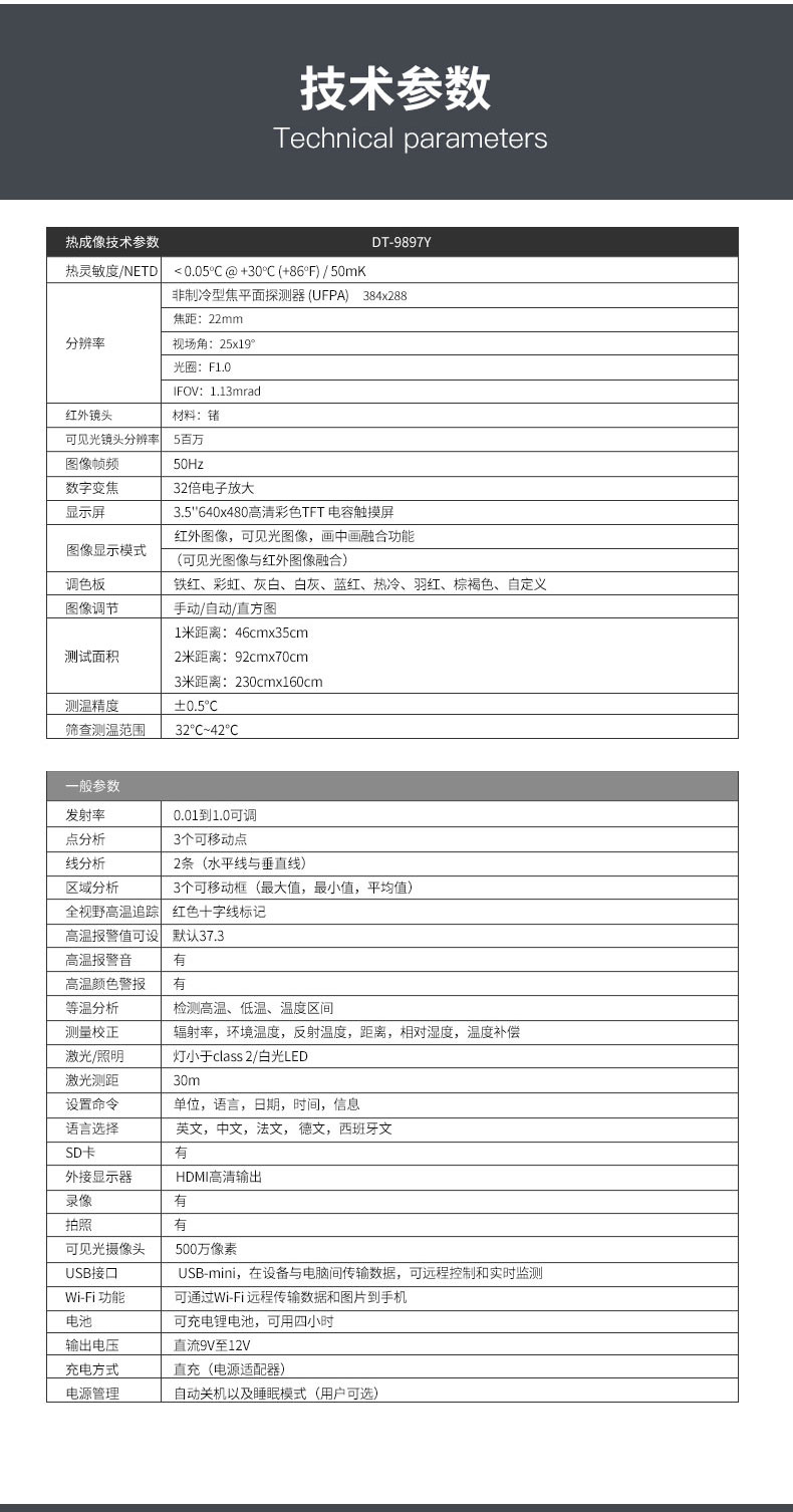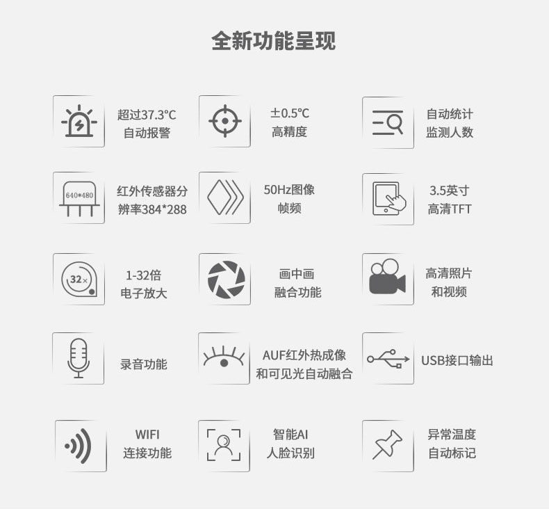 分辨率:384*288、圖像幀頻:50HZ、篩查測溫范圍:32-42℃、HDMI輸出大屏全屏顯示、AI人臉識(shí)別、自動(dòng)統(tǒng)計(jì)監(jiān)測人數(shù)、可同時(shí)完成多人測溫。