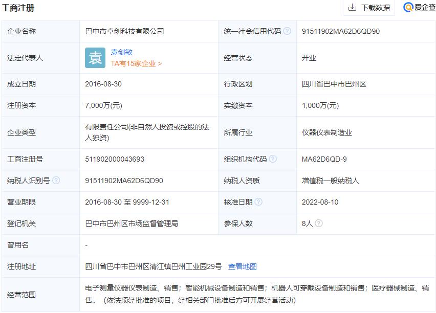 現(xiàn)巴中市卓創(chuàng)科技有限公司注冊(cè)資本:7,000萬(wàn)(元) 經(jīng)營(yíng)范圍:電子測(cè)量?jī)x器儀表制造、銷售;智能機(jī)械設(shè)備制造和銷售;機(jī)器人可穿戴設(shè)備制造和銷售;醫(yī)療器械制造、銷售。