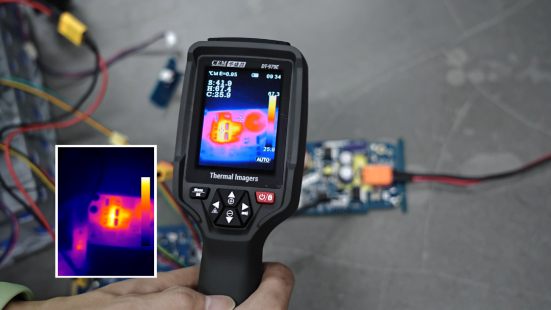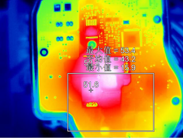 使用紅外熱像技術(shù)對(duì)PCB電路板進(jìn)行發(fā)熱測(cè)試。下圖為PCB電路板的發(fā)熱情況測(cè)試,需要觀測(cè)PCB電路板表面的溫度分布情況,來(lái)確認(rèn)是否處于工作溫度內(nèi)。